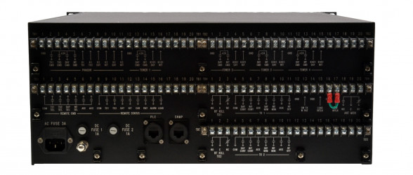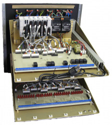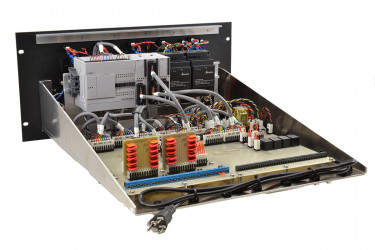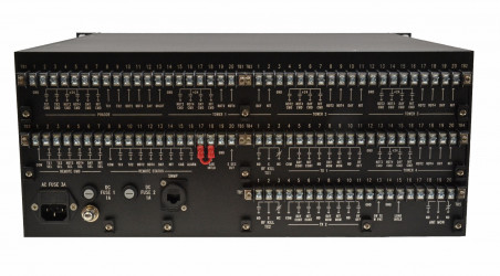 The control outputs are 24VDC, so no high voltage is wired to the controller, allowing phasing systems with contactor pilot relays to be directly connected. In cases where a station’s contactors receive 120 or 240 VAC, an additional cabinet is available. This 2 RU aluminum box contains 24 volt power relays to switch the AC.
